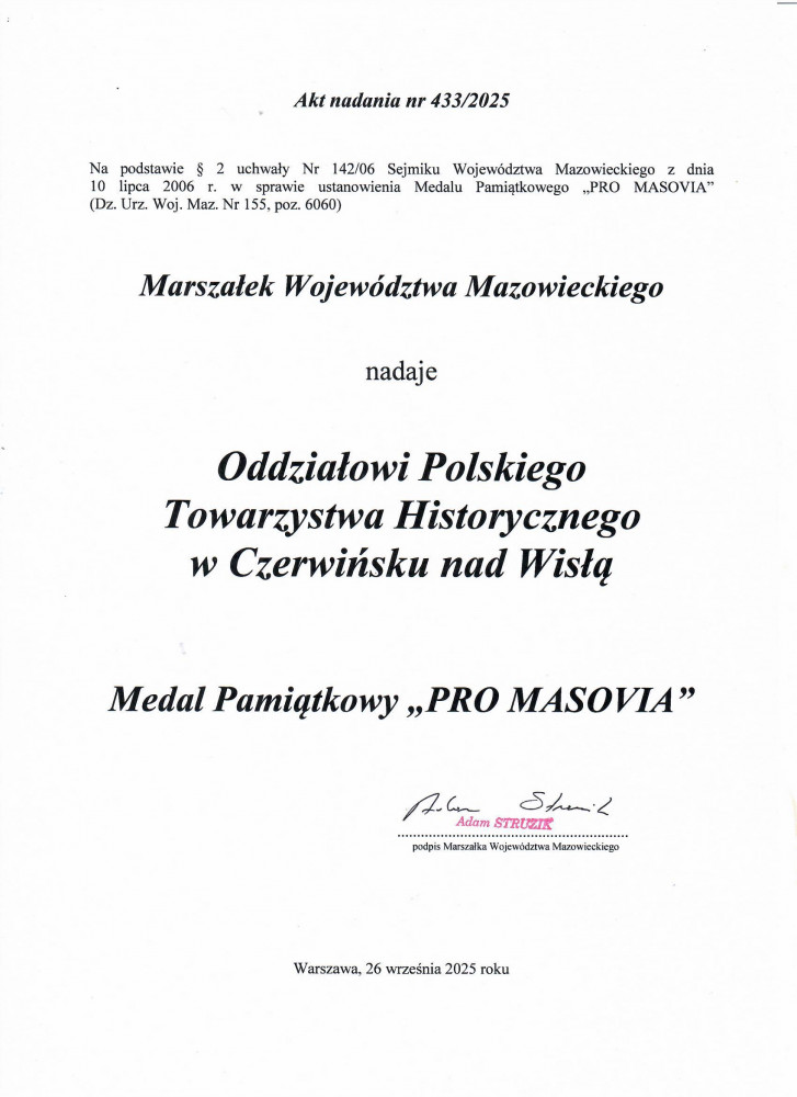 Pan Adam Struzik Marszałek Województwa Mazowieckiego zauważył naszą działalność na rzecz ochrony i pielęgnowania naszego dziedzictwa, kształtowania tożsamości narodowej oraz rozwijania świadomości kulturowej i historycznej mieszkańców Mazowsza i uhonorował Oddział Medalem Pamiątkowym ,,Pro Masovia” za wybitne zasługi i całokształt działalności na rzecz województwa mazowieckiego. Medal w imieniu Marszałka wręczył wicestarosta powiatu płońskiego Pan Jacek Ryziński.